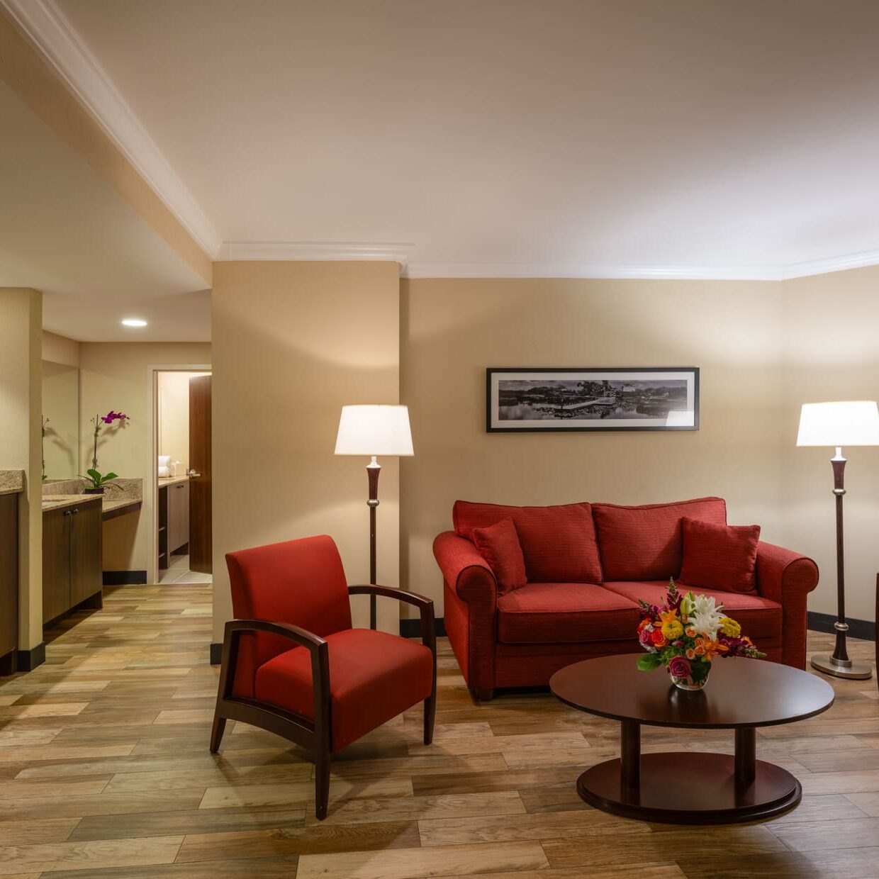 This spacious suite features two queen beds and a living area with a sleeper sofa, 65" TV, refrigerator, microwave, and plush seating for guests to gather and celebrate the night.