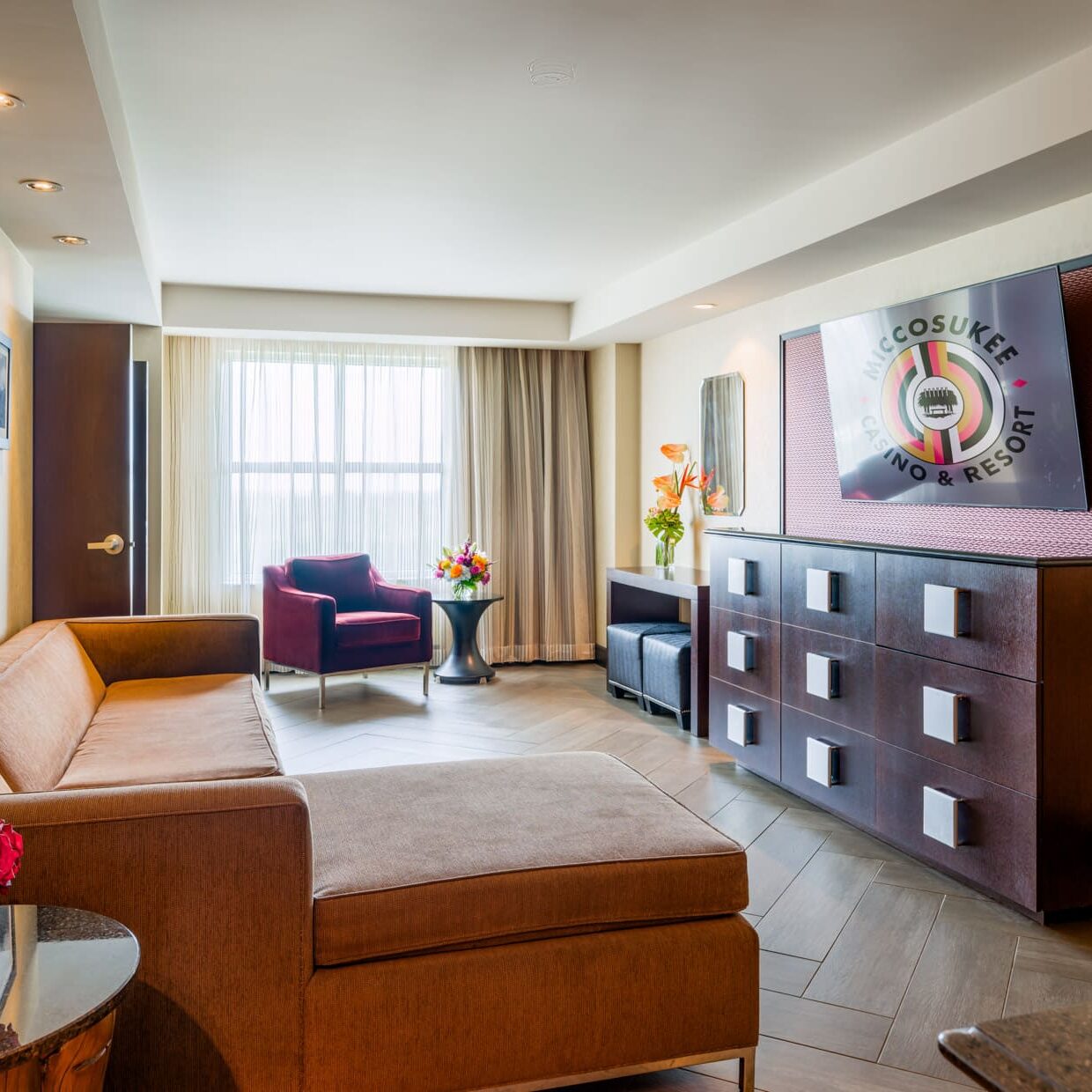 This accommodation features a spacious king-size bed, a 65" TV, and a separate living area. The living area includes a sleeper sofa, wet bar, refrigerator, and microwave.